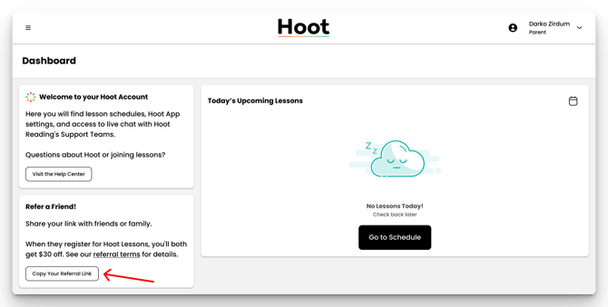 You can refer friends or family to Hoot Reading and earn a reward when they sign up.